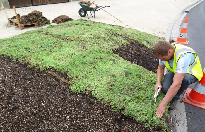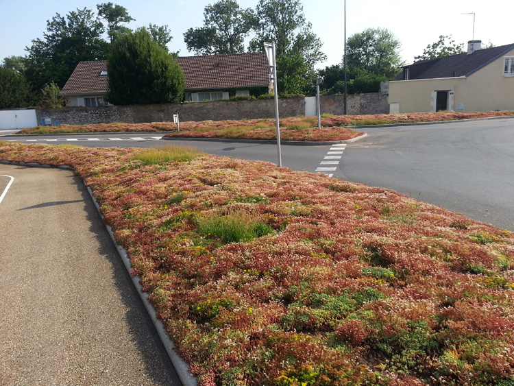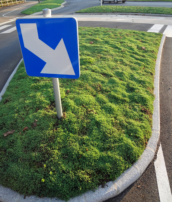 Rond point végétalisé à l'aide de tapis de sedum précultivé i.D. MAT. Couvert végétal : i.D. SEDUM