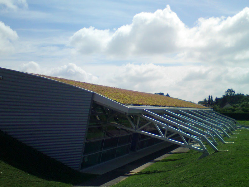 Toiture végétalisée du gymnase de Saint Genis Laval. Réalisation de la couverture végétale avec le bac pré-cultivé HYDROPACK® conçu par Le Prieuré.