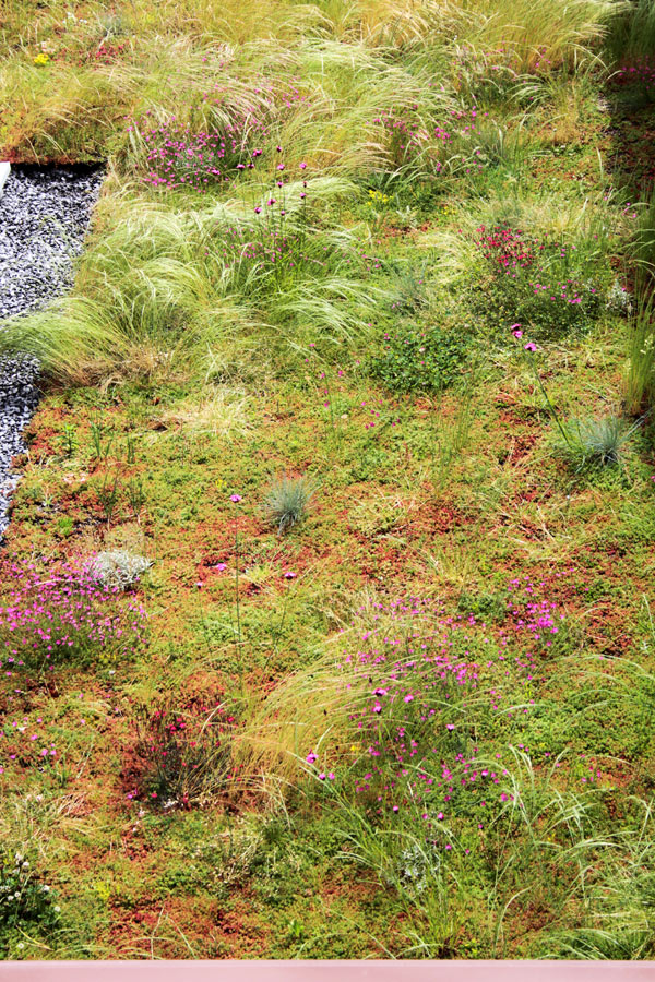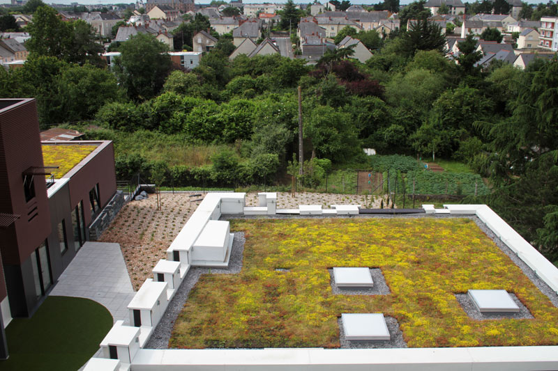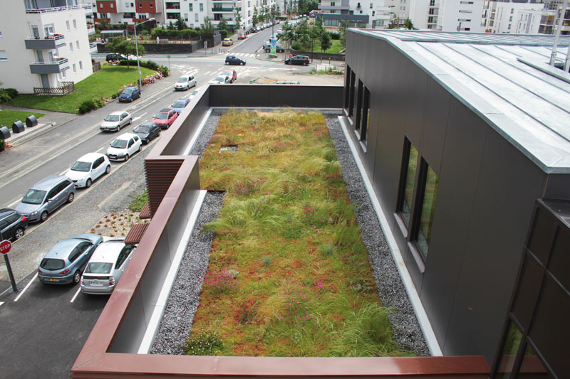 Toiture végétalisée réalisée avec le bac HYDROPACK® et le couvert végétal i.D. MIX-FLORE.